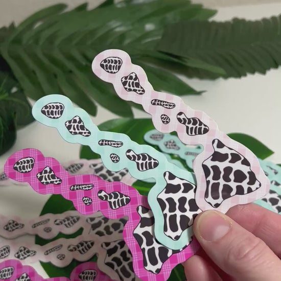 This Hawaiian Islands sticker features a unique custom design: each island is filled with the beautiful of a Hebrew Cone Shell, set against a palaka-style background. Available in three colors — hot pink, sea foam, or light pink. Printed on waterproof glossy vinyl and 4 inches wide, it’s perfect for water bottles, cars, laptops, and more.