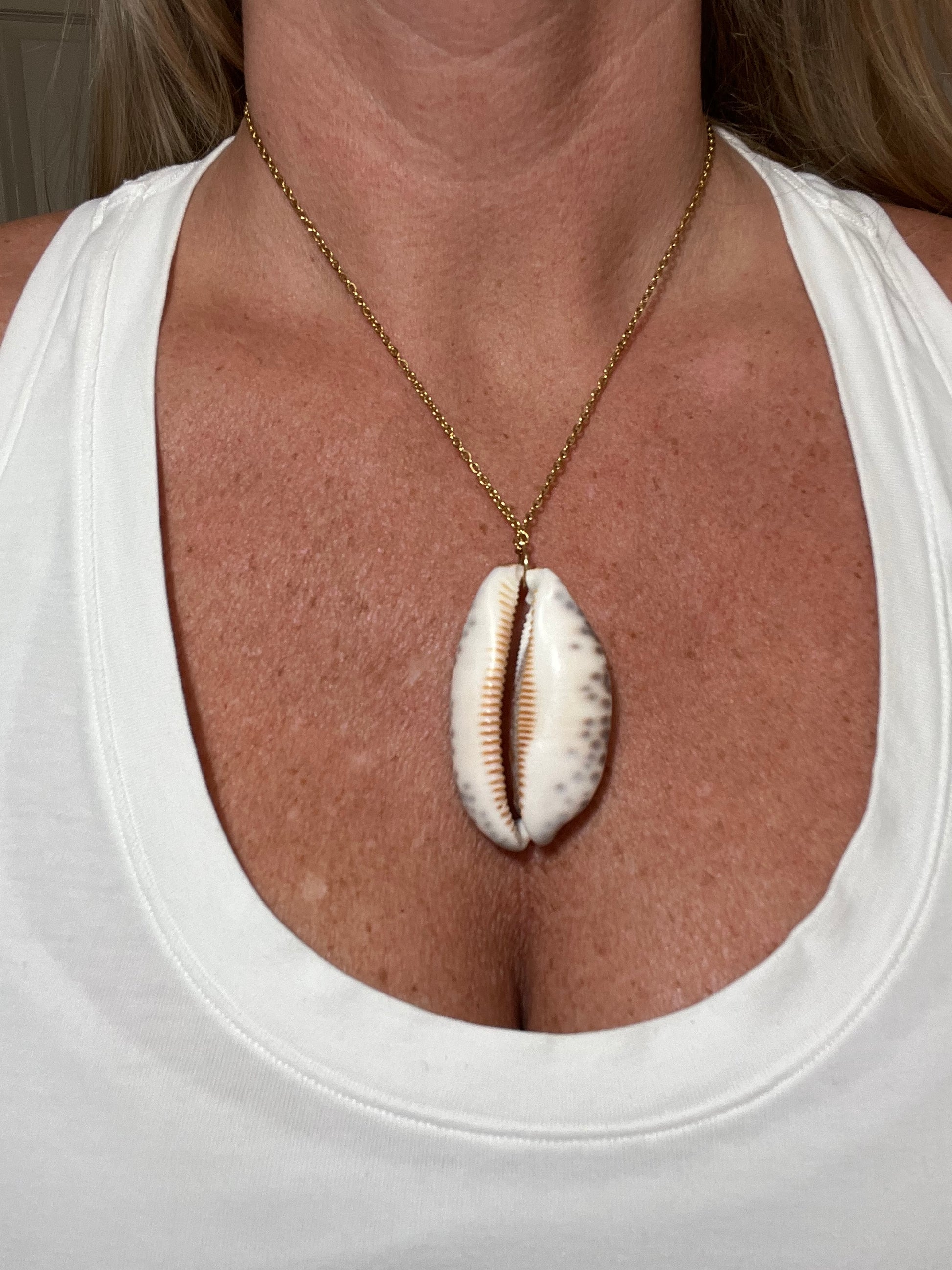 A Hawaiian Tiger Cowry Lip shell on a gold-plated 18-inch chain. A timeless piece with a natural island feel, perfect for everyday wear or gifting.